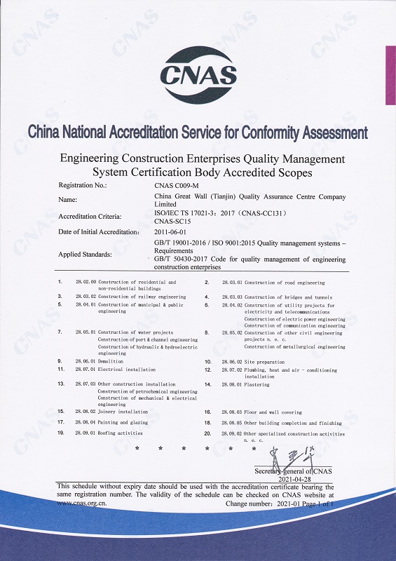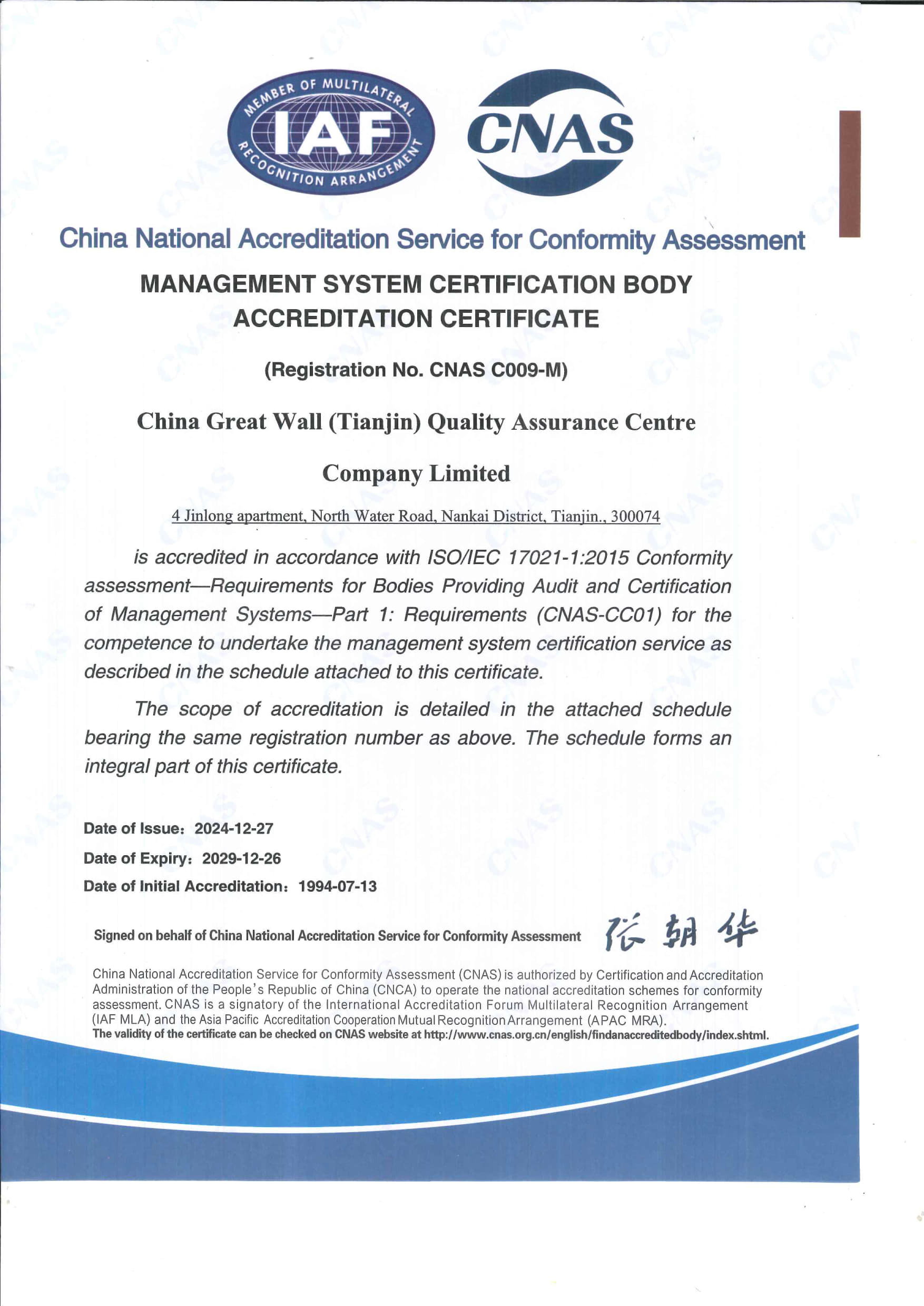 長城中心管理體系認(rèn)證機(jī)構(gòu)認(rèn)可證書 英文