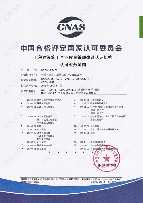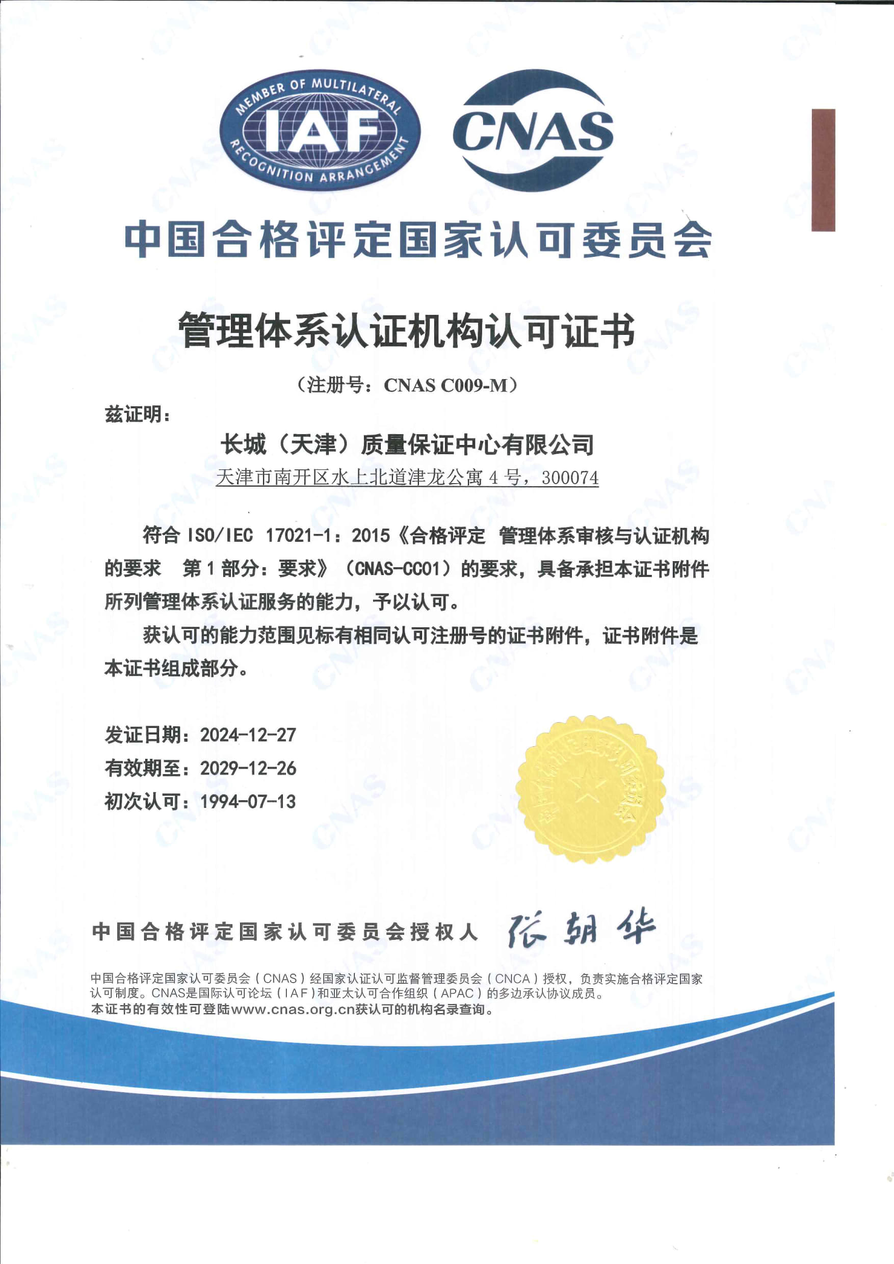 長城中心管理體系認(rèn)證機(jī)構(gòu)認(rèn)可證書 中文